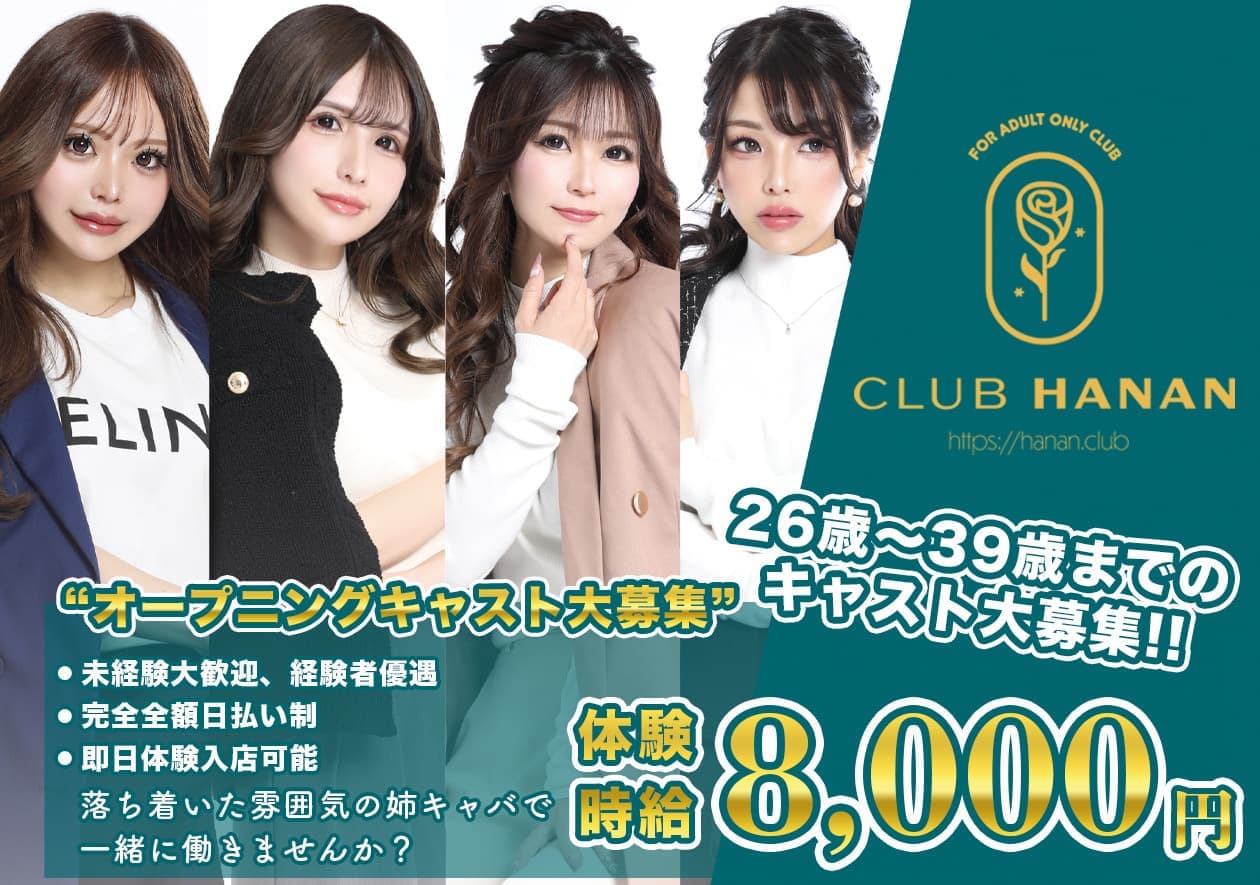 クラブハナンが満を持して錦に登場 オープニングキャストで26歳以上のキャストを大募集中!平均年齢26歳以上39歳までの落ち着いた綺麗系女性が多く在籍しており、店内も落ち着いた雰囲気の大人の姉キャバです!